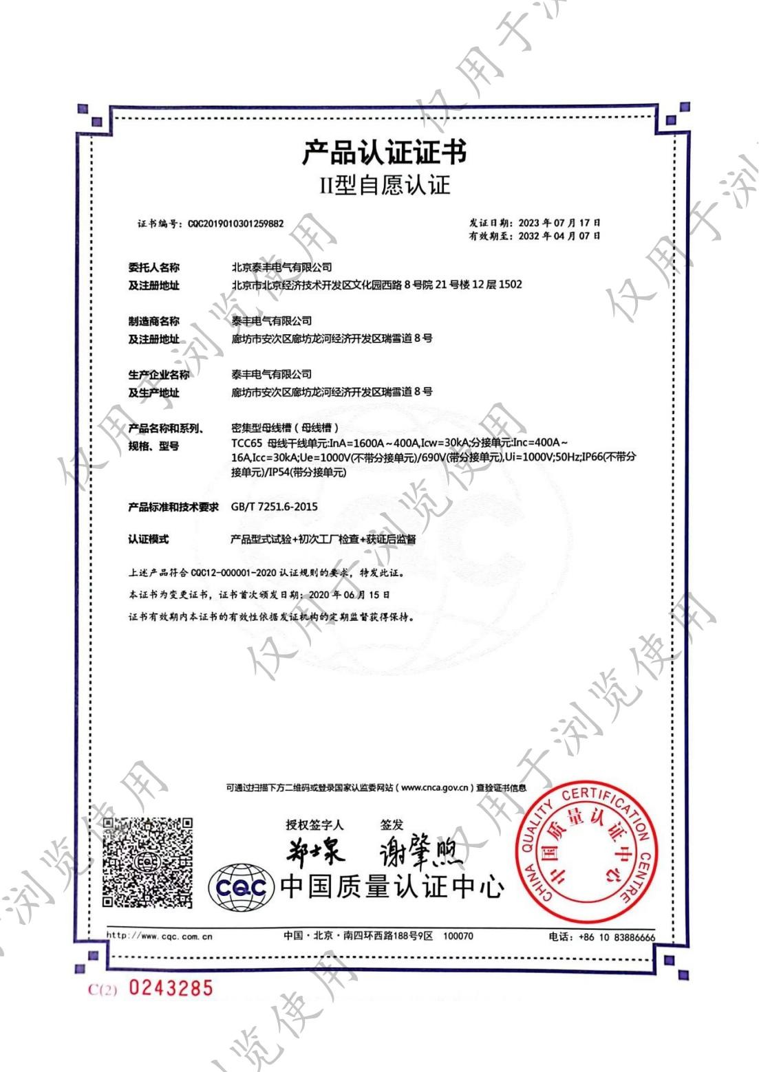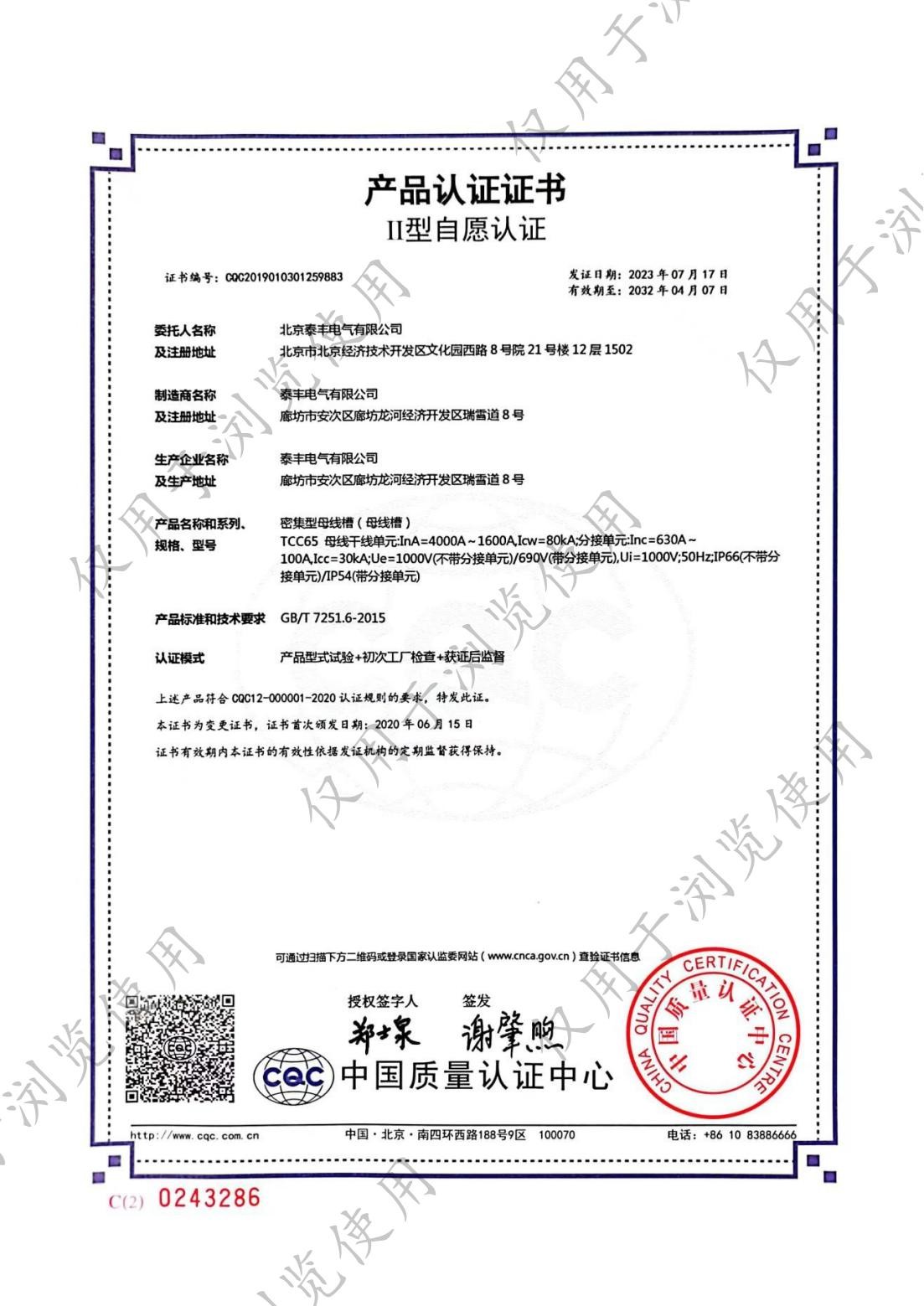 ■ 生产的母线槽系列、电缆桥架顺利地通过了IS09001标准质量体系认证、母线槽系列均通过CCC认证,母线槽电流达到6300A,2006年5月电缆桥架系列产品顺利通过了CQC自愿性产品认证。